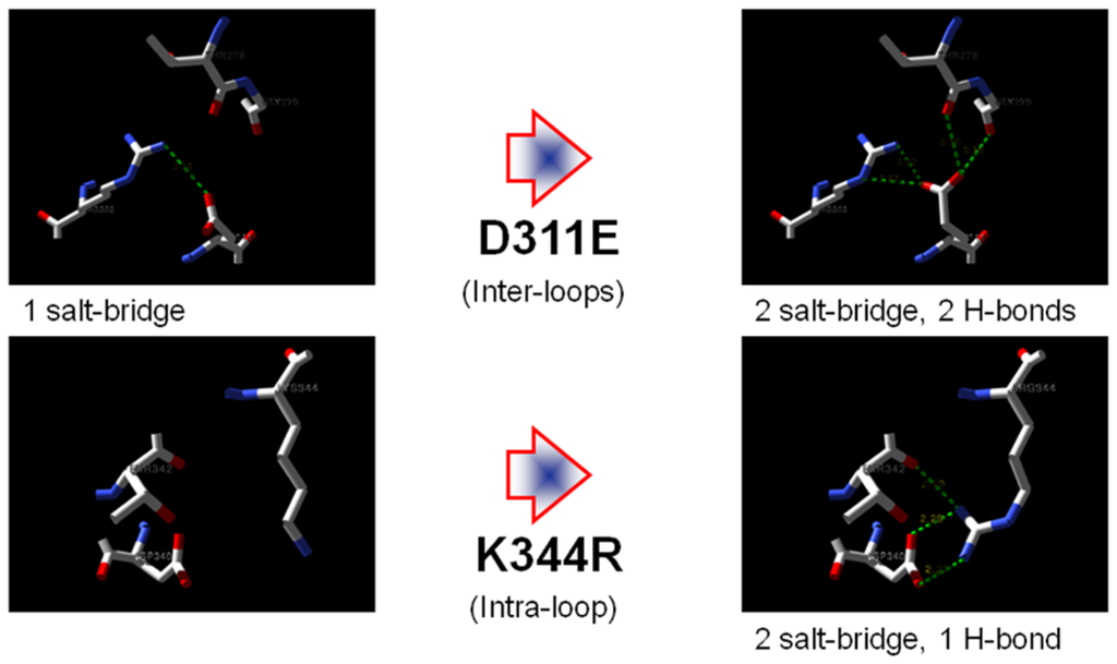 | D311E | Glu 311 | OE1 | Arg 303 | NH2 | 5.2 |