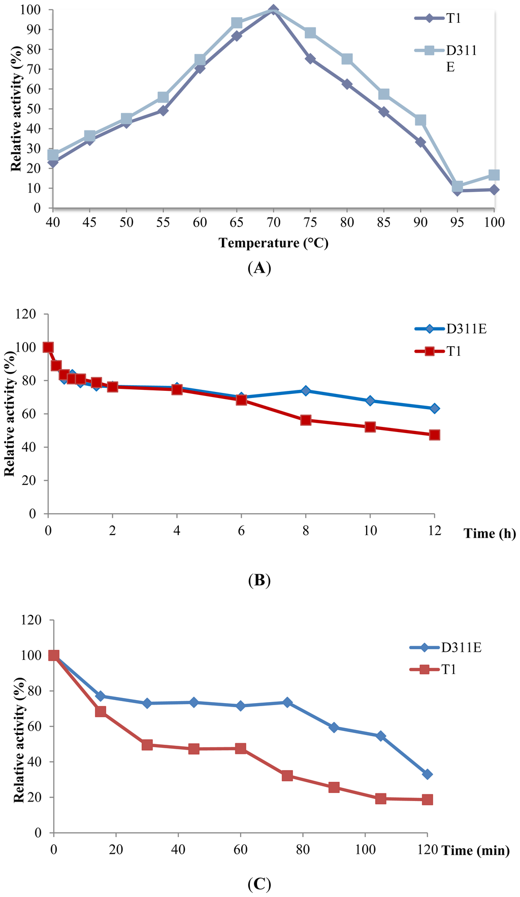 3.6. Effect of Temperature on D311E and T1 Lipase Activity and Stability