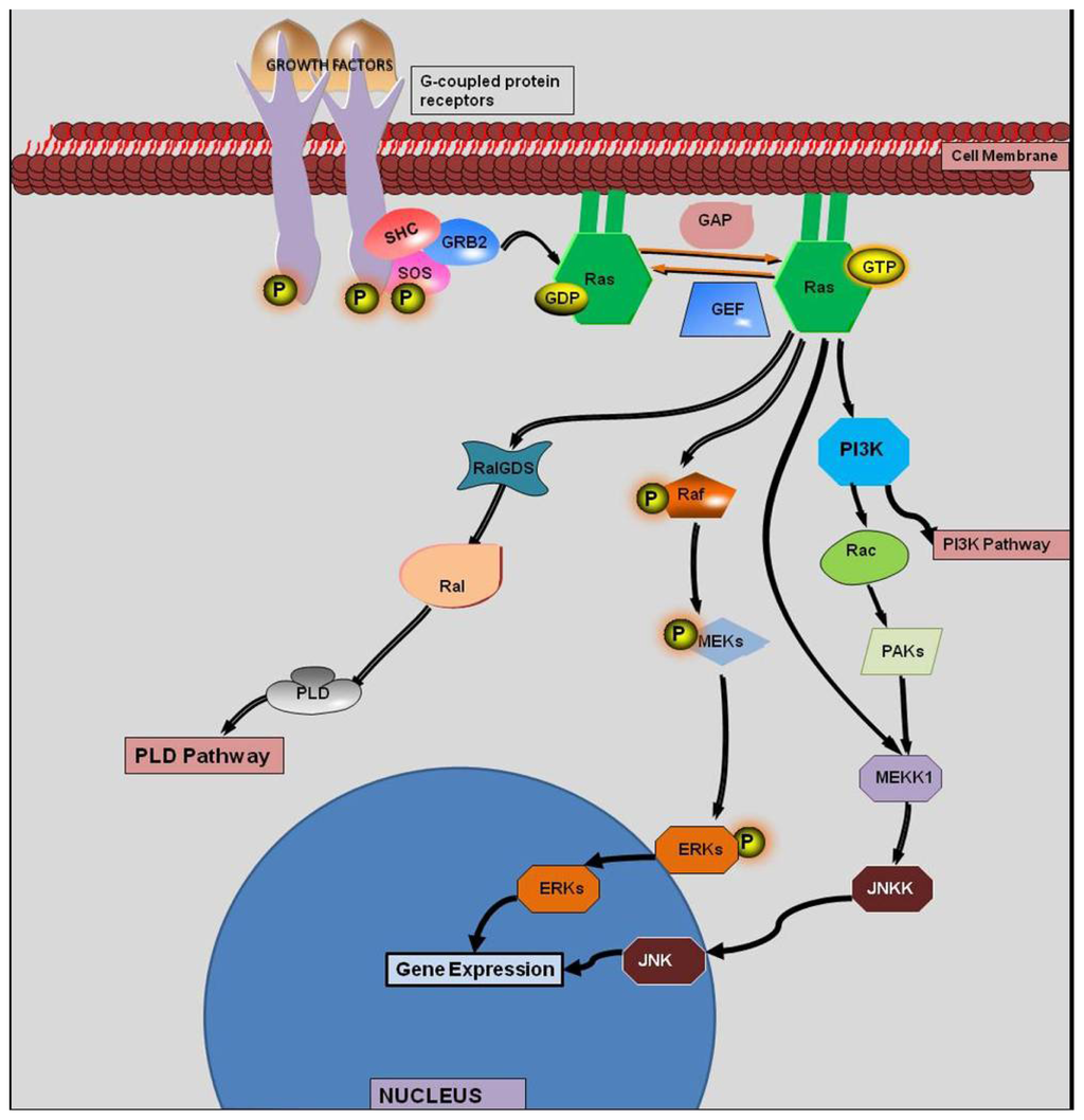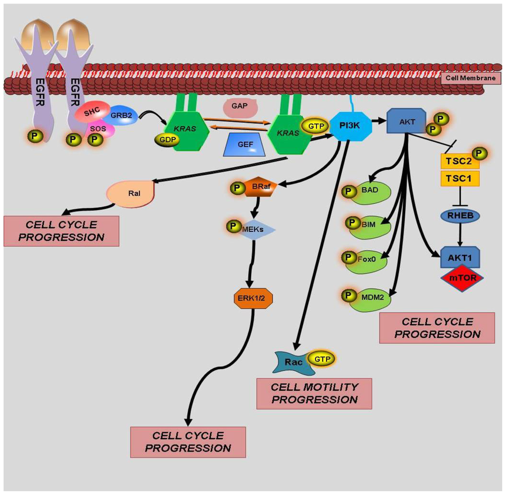 As expected, an improved response to therapy correlates with more favorable outcomes. In metastatic colorectal cancer, increased response rates to treatment are associated with improvements in progression free survival and overall survival [36]. However, the detection of KRAS mutations has been associated with decreased response rates to select chemotherapeutic agents. Therefore, KRAS mutational status is a critical factor when considering the use of targeted therapies. The association of KRAS gene mutation and response to therapy was first reported in patients with metastatic colorectal cancer, who were treated with anti-epidermal growth factor receptor (EGFR) agents. Lievre et al. first reported the link between KRAS gene mutation and decreased response to anti-EGFR agents [37]. Additionally, they noted in a retrospective analysis that patients with wild-type KRAS had better overall survival compared to patients harboring mutant KRAS [37]. Given that EGFR, a transmembrane receptor tyrosine kinase, is overexpressed in 25%–75% of colorectal tumors [38,39], a significant proportion of patients that may benefit from anti-EGFR agents may also have KRAS mutation. Similar to KRAS mutations, EGFR overexpression has also been linked to poor prognosis and increased risk of metastasis in colorectal cancer and, therefore, represents a promising therapeutic target [40,41]. Upon activation of EGFR, K-RAS is activated downstream [42] and results in downstream signaling through the PI3K and extracellular signal regulated kinase (ERK) pathways [42] (Figures 2 and 3). Thus, K-Ras is a critical mediator of EGFR-induced signaling cascades (Figure 3). Accordingly, other alterations in the mediators of the EGFR pathway (e.g., mutation of BRAF, PTEN, PIK3CA, etc.) could further modify the response to anti-EGFR therapies [43–46].