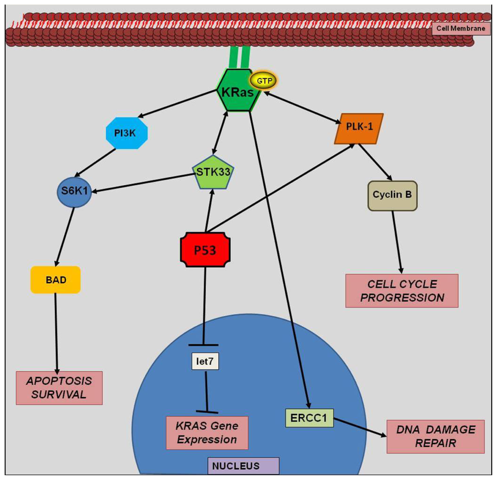 Another approach to targeting oncogenic KRAS is synthetic lethality, a phenomenon in which a combination of two or more gene mutations leads to cell death, but a mutation in one of those genes alone does not compromise cell viability [80]. The clinical significance of this approach lies in the ability to create better therapeutic options by increasing cytotoxic specificity against cancer cells without the toxicities associated with current chemotherapy. This also opens up the potential to target mutant KRAS-driven cancers, which thus far have no effective therapeutics. In a genome-wide screen, Luo et al. identified several genes in the mitotic pathway that have synthetic lethal interactions with KRAS [81]. In that study several potential targets for developing RNAi-based therapies or small molecule inhibitors against these synthetic lethal genes were uncovered. The complexity of synthetic lethal interactions with KRAS underscores the complications of regulating KRAS expression and activity.