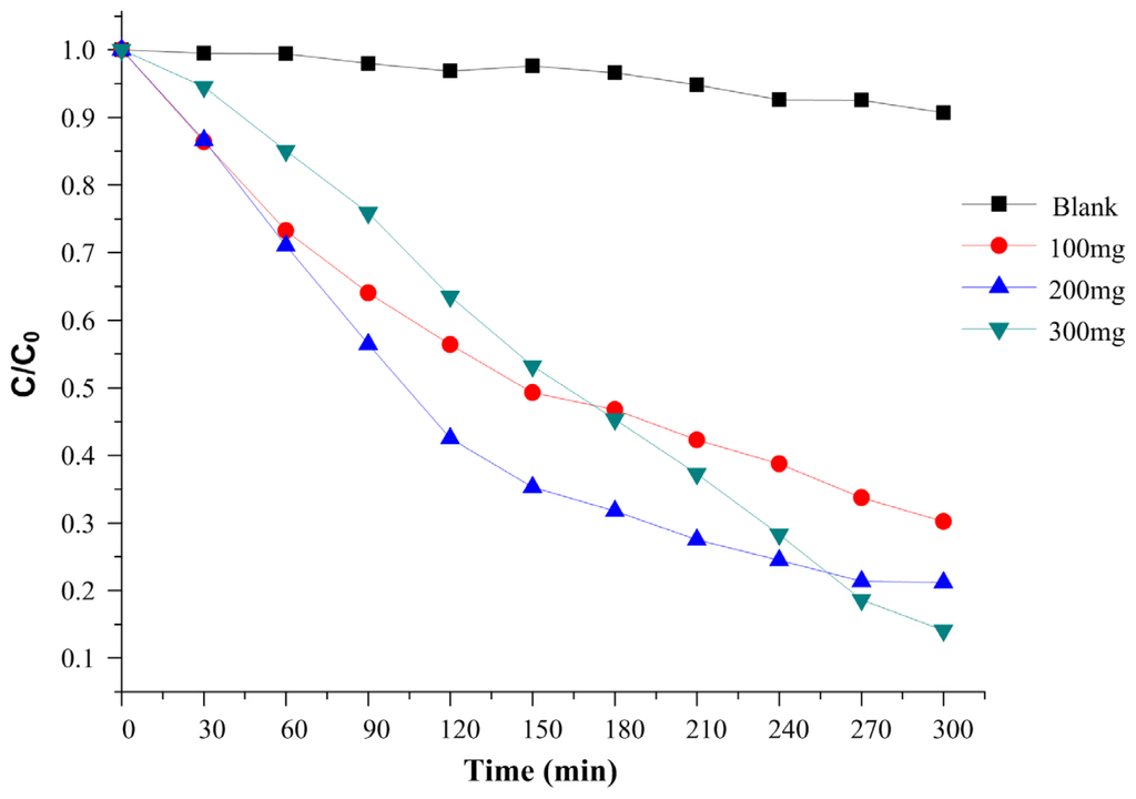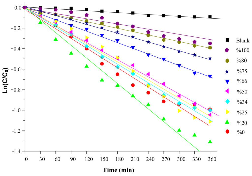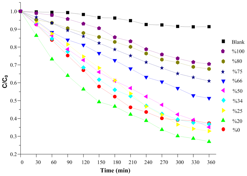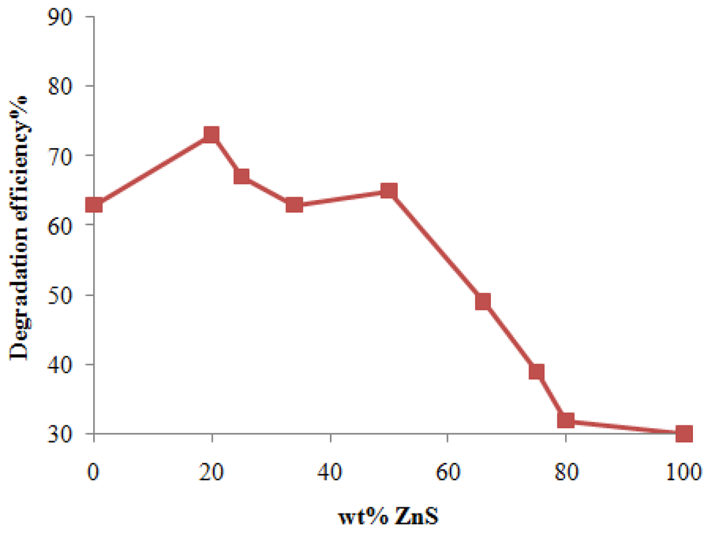 | Sample | ZnS:CdS | wt% ZnS (mg) | wt% CdS (mg) | Half-life (min) | Degradation efficiency% | Rate const. after 360 min (×10−3 (min−1)) |