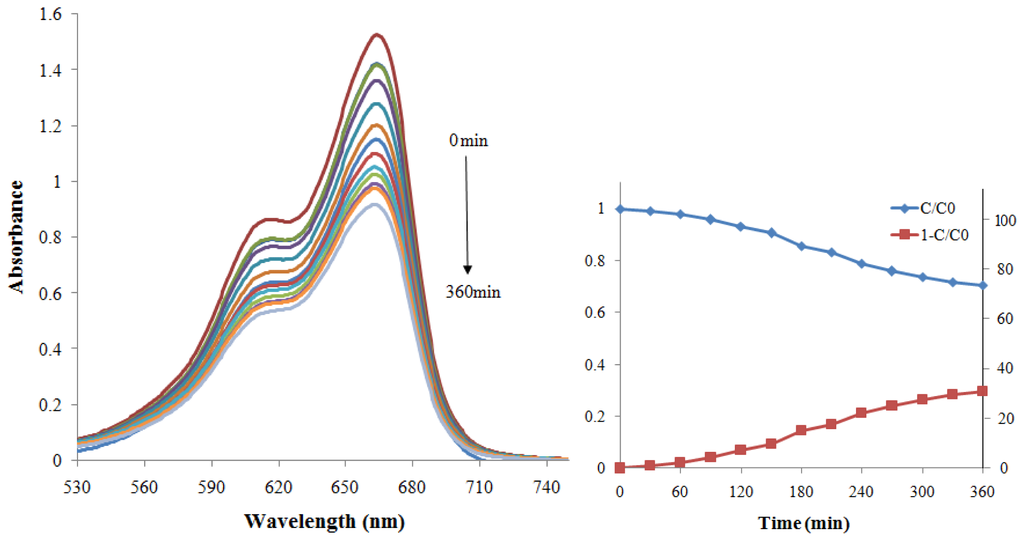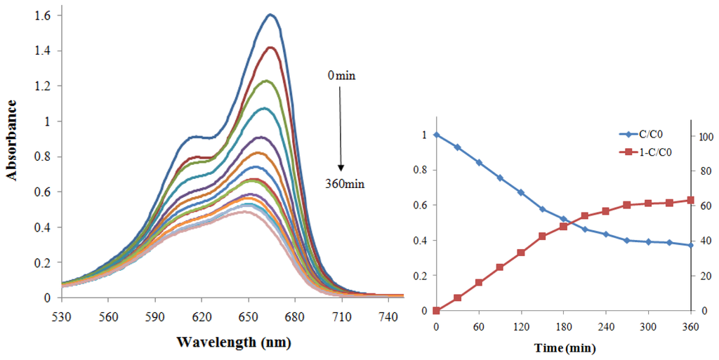 - Wang, K.; Yu, L.; Yin, S.; Li, H.; Li, H. Photocatalytic degradation of methylene blue on magnetically separable FePc/Fe3O4 nanocomposite under visible irradiation. Pure Appl. Chem 2009, 81, 2327–2335. [Google Scholar]