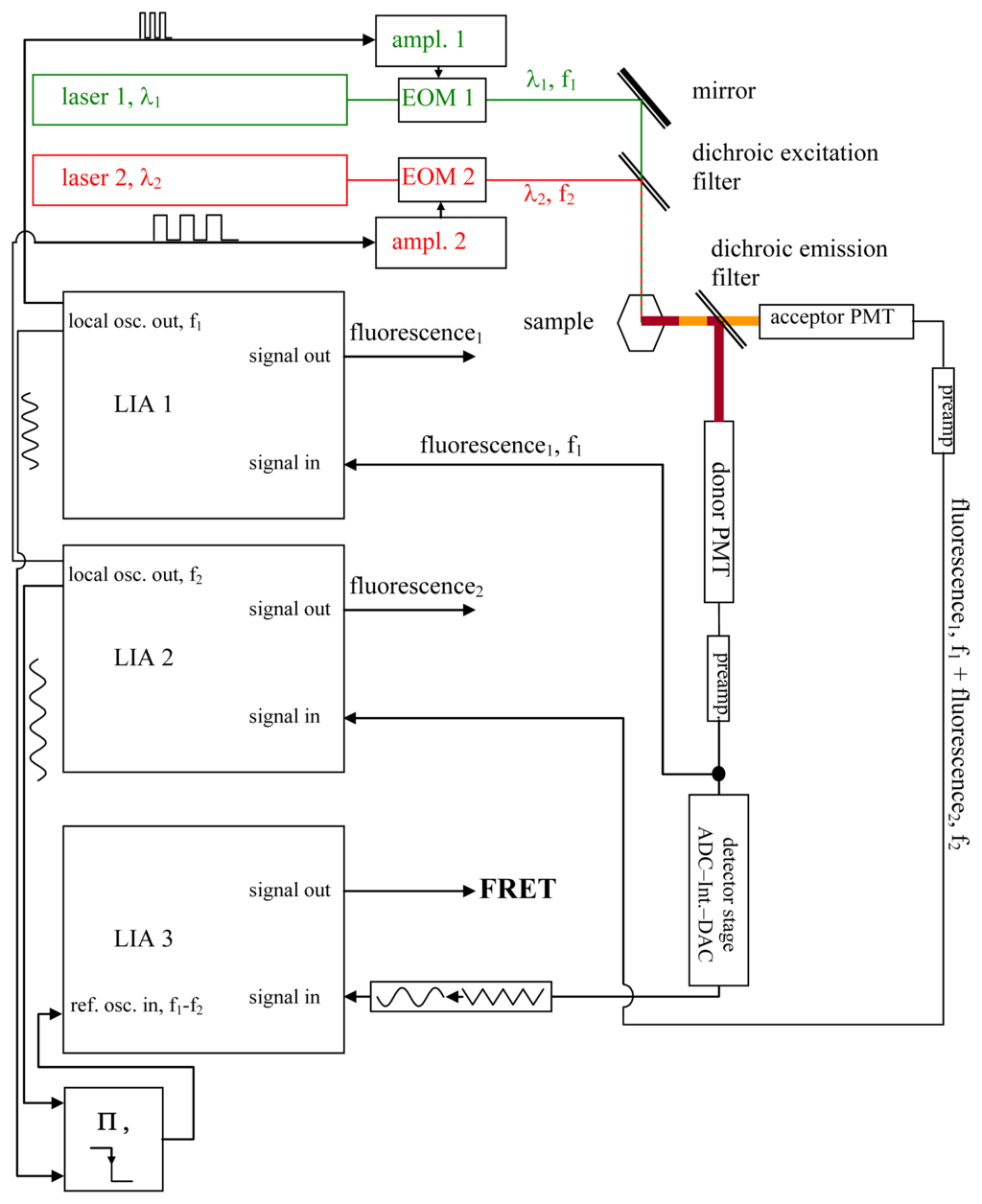 - Donor excitation and acceptor excitation are close to in phase.In this case, the donor fluorescence as well as the acceptor fluorescence are modulated at either f1 or f2, at which the modulation will be quite deep. There are strong signals in LIA1 and in LIA2 before the respective amplifier stage. In this simplified analysis it is assumed that during (a) and those parts of (c) (see below) when the direct excitation of the acceptor by the laser beam at λ2 and FRET excitation of the acceptor are competing, laser excitation is dominantly strong. A quantitative analysis is provided later on in this article.