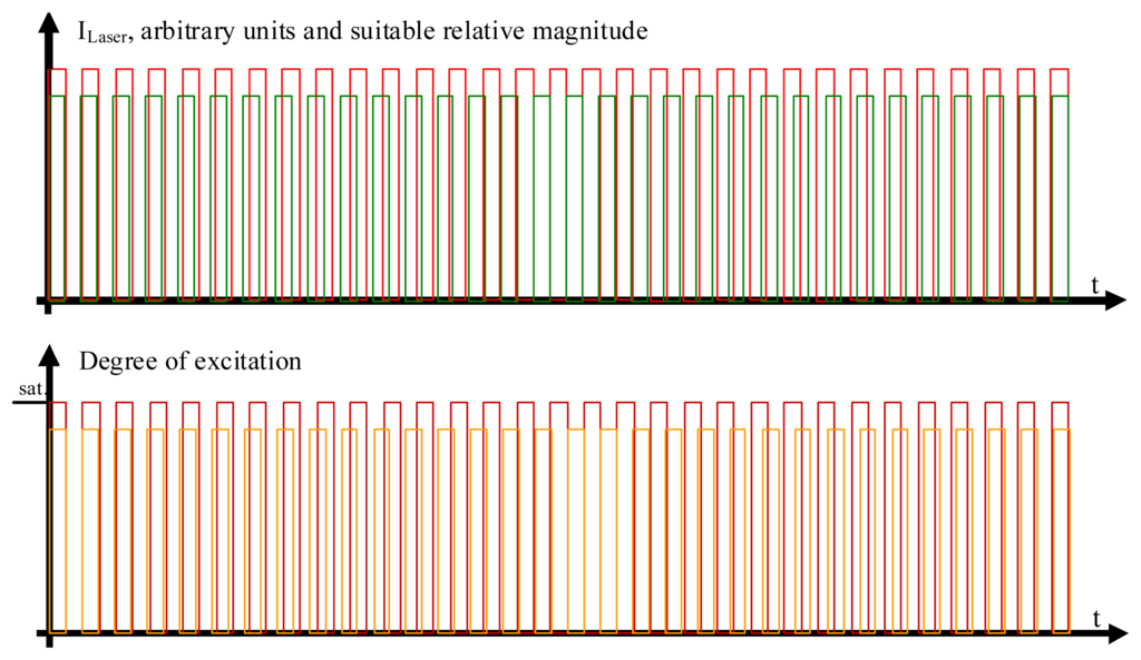 The laser beam excitations and degrees of modulation. In the upper part of the figure, the rectangle-shaped modulation pattern of the two laser beams is shown. The modulation frequency of the laser light exciting the acceptor chromophores, colored in red, is slightly different from the modulation frequency of the laser beam exciting the donor chromophores, colored in green. The respective degrees of excitation of the acceptor molecules (deep red color) and donor molecules (colored in orange) are shown in the lower part of the figure. While it helps to understand the molecular processes in qualitative terms if one first assumes that the acceptor beam is so strong as to completely saturate the excited state in all acceptor molecules in the measurement volume, it is not necessary that the laser beam exciting the acceptor molecules in fact be so strong that it effects a degree of excitation of the ensemble of the involved acceptor molecules close to saturation, as will be shown in the quantitative analysis.