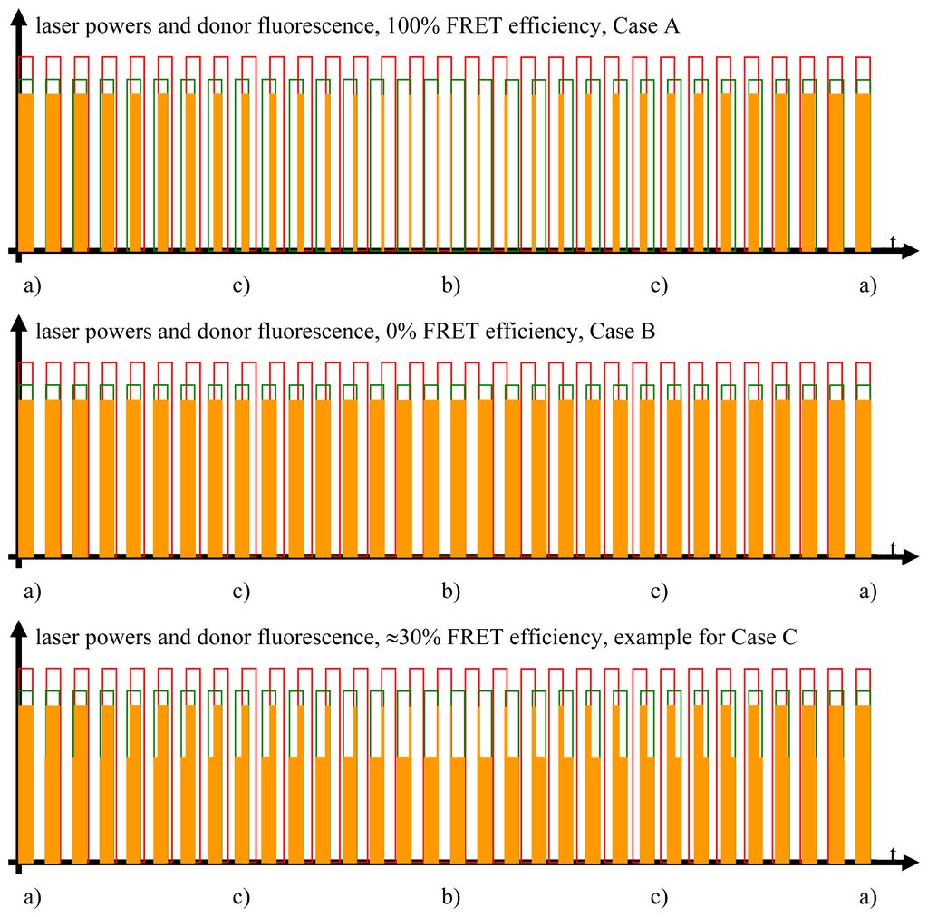 Donor fluorescence as a function of the FRET efficiency. The FRET efficiency is detected via the donor fluorescence. In this figure, the donor fluorescence, symbolized by the orange rectangles, is shown as a function of the time and the FRET efficiency. Unaltered donor fluorescence is only generated when there is solely donor excitation with no simultaneous FRET. Depending on the FRET efficiency, a certain fraction of the excitation energy stored in the excited donor molecules is not emitted as fluorescence but radiationlessly transferred to the acceptor. This is the reason for the shapes of the “geometrically distorted” orange rectangles in the case of the example of 30% FRET efficiency (see text for detailed explanation).