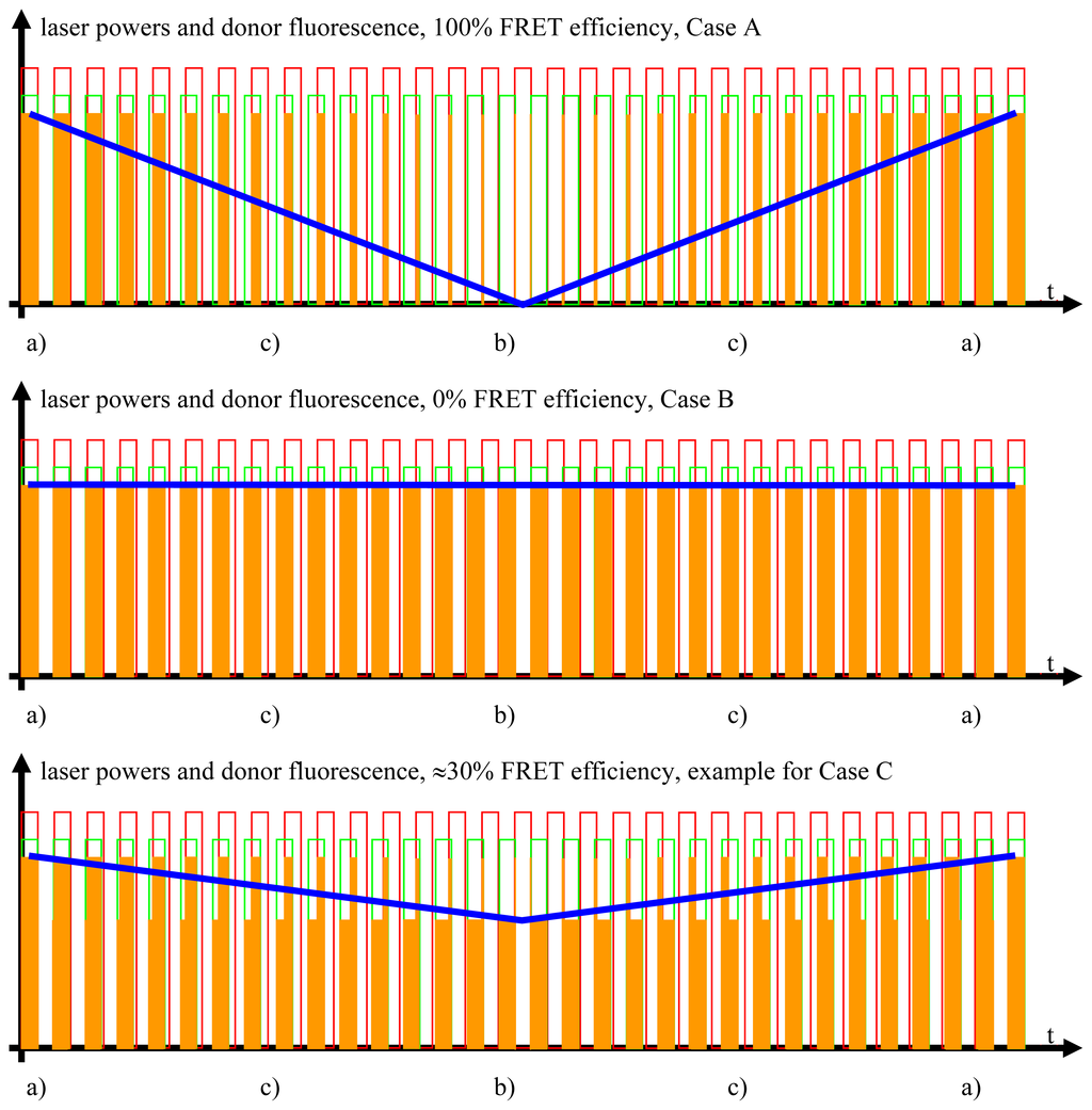 - All intermediate states.(a) and (b) will be present, each during its respective part of the oscillation period. The average value of the donor fluorescence—integrated over many modulation periods—will oscillate at the beat frequency. The envelope of this beat oscillation is a triangular signal, which LIA3 registers if the signal by the donor fluorescence PMT has been pre-processed by a detector stage/“ADC-Integrator-DAC” circuit prior to de-modulation.