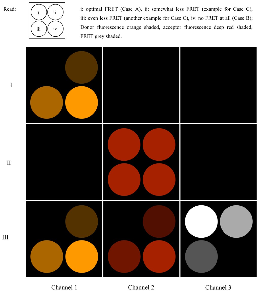 - Xie, F.; Zhu, J.; Deng, C.; Huang, G.; Mitchelson, K.; Cheng, J. General and reliable quantitative measurements of fluorescence resonance energy transfer using three fluorescence channels. Analyst 2012, 137, 1013–1019. [Google Scholar]