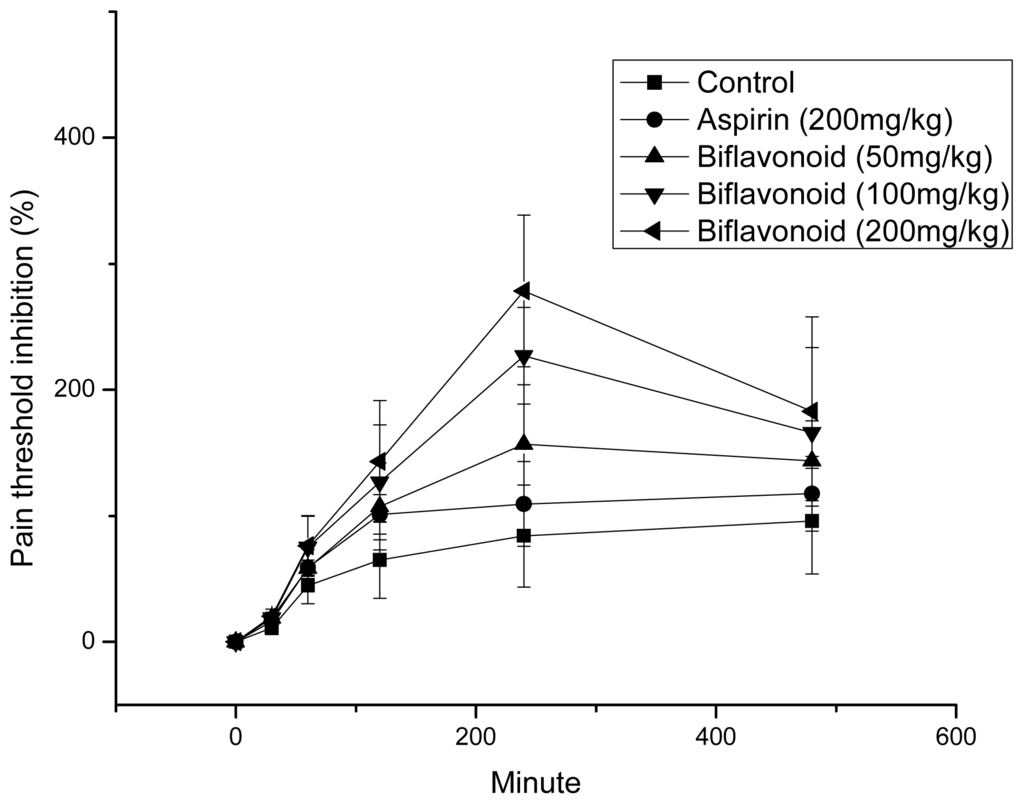Administration of biflavonoid decreased the number of writhing in mice and the effect was found to be dose dependent. The reduction was significant (p < 0.01) when compared to control. The maximum inhibition of writhing was 54% at dose of 200 mg/kg of biflavonoid, the effect was slightly lower than aspirin. The results are given in Table 4.