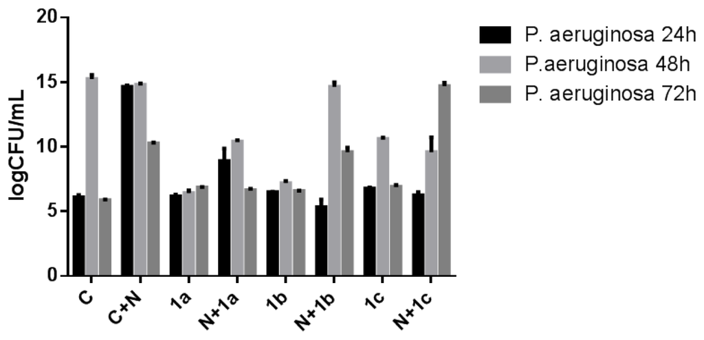 The viable cell counts recovered from P. aeruginosa biofilms developed on the catheter pieces harvested at different incubation times (C+N—catheter coated with nanoparticles; C—catheter control; 1a, 1b, 1c—catheter pieces immersed in pure chemicals solutions without being attached to the nanoparticles; N+1a, N+1b, N+1c—catheter pieces immersed in pure chemicals solutions attached to the nanoparticles).