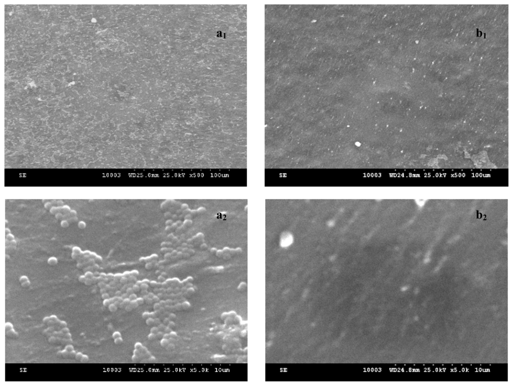 S. aureus biofilm architecture examined by Scanning Electron Microscopy (SEM) for (a) uncoated and (b) coated (core/shell/1b) prosthetic devices after 24 h of incubation (a1—S. aureus biofilm developed on the untreated catheter surface, covering homogenously the entire surface; a2—S. aureus colonies developed on the untreated catheter surface; b1—rare microbial cells adhered to the surface of the functionalized catheter; b2—functionalized catheter surface without any adhered bacterial cells).