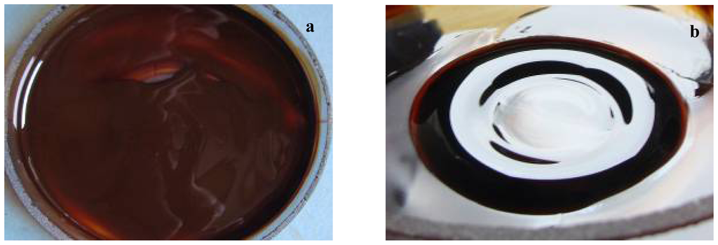 Core/shell/adsorption-shell nanostructure solubilised in chlorofom: (a) without magnetic field; (b) alligned in magnetic field.
