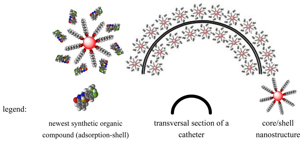 The layer of core/shell/adsorption-shell on prosthetic device was achieved by submerging the catheter pieces in 5 mL of nanofluid aligned in a magnetic field of 100 Kgf applied for 1 s. Then, the catheter pieces were extemporaneously dried at room temperature. The rapid drying was facilitated by the convenient volatility of chloroform [36]. The coated prosthetic devices were then sterilized by ultraviolet irradiation for 15 min. Figure 5 presents a schematic representation of prosthetic device coated with core/shell/adsorption-shell nanostructure.