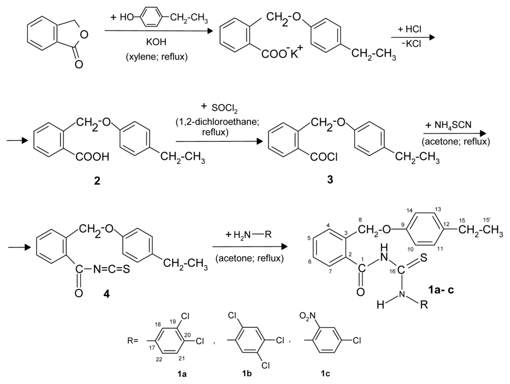 - Limban, C.; Missir, A.V.; Chiriţă, I.C.; Niţulescu, G.M.; Ilie, C.; Căproiu, M.T. Some new 2-(4-ethyl-phenoxymethyl)benzoic acid thioureides: synthesis and spectral characterisation. Rev. Chim. (Bucharest) 2009, 60, 657–661. [Google Scholar]