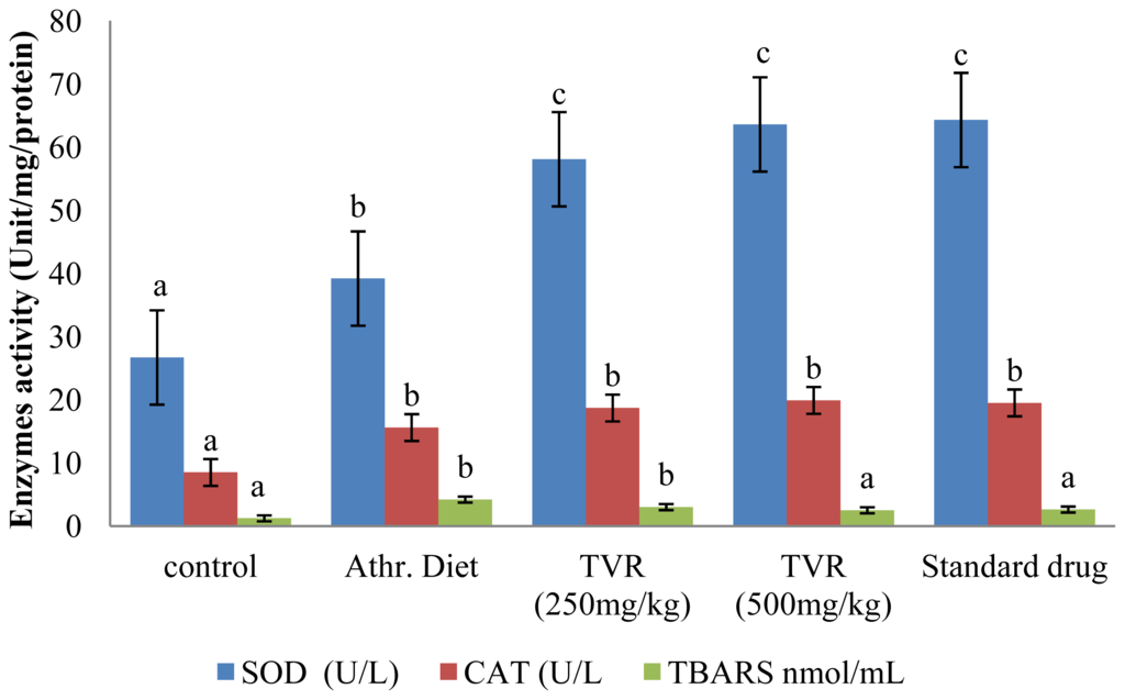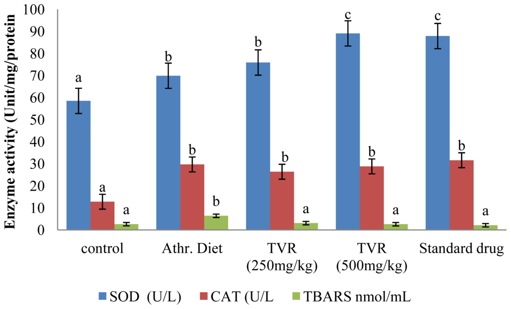 Effect of various doses of TVR on activity of tissue antioxidant enzymes in liver of diet-induced atherogenic rats. Mean values with the same letter subscripts within the different group are not significantly different (p < 0.05).