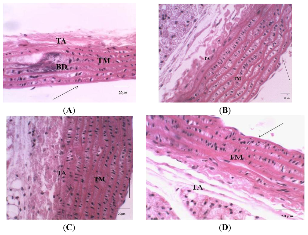 Photomicrograph of rat aorta. (A) The aorta of atherogenic rat; (B) Control aorta of rat; (C) The aorta of (atherogenic diet +500 mg/kg of RTV) rat; (D) The aorta of (atherogenic diet + 30 mg/kg of atorvastatin) rat. Showing straight tunica intimae (thin- dark arrow); Tunica media (TM) with elastic fibers, basophilic changes (BD) and tunica adventitia (TA). Scale bar: 20 μm, H & E stain, 400× magnification).