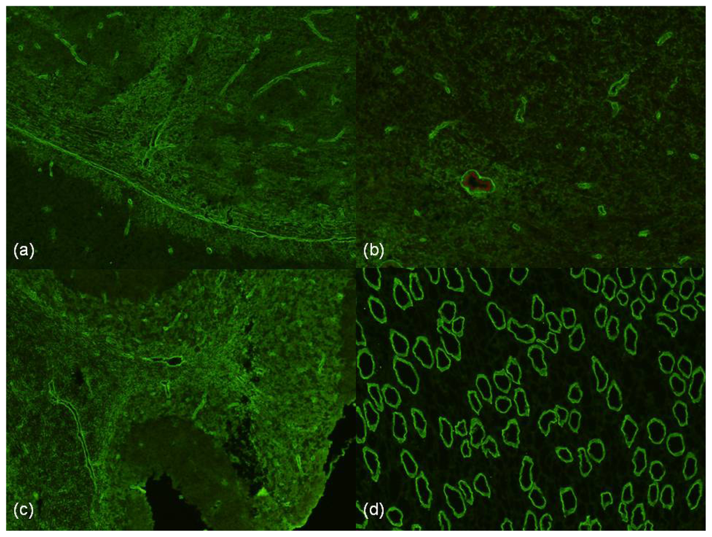 Figure 1. NMO positive Immunofluorescence on a composite of mouse cerebellum, midbrain and kidney (serum dilution 1:40, goat anti-human IgG F(ab)2 fluorescein isothiocyanate, 200× magnification). (a) and (b) staining of subpial surface and microvessels of the midbrain. (c) Microvessel staining of cerebellar granular layer, molecular layer and white matter. (d) Staining of the papillary tubules of the kidney.
