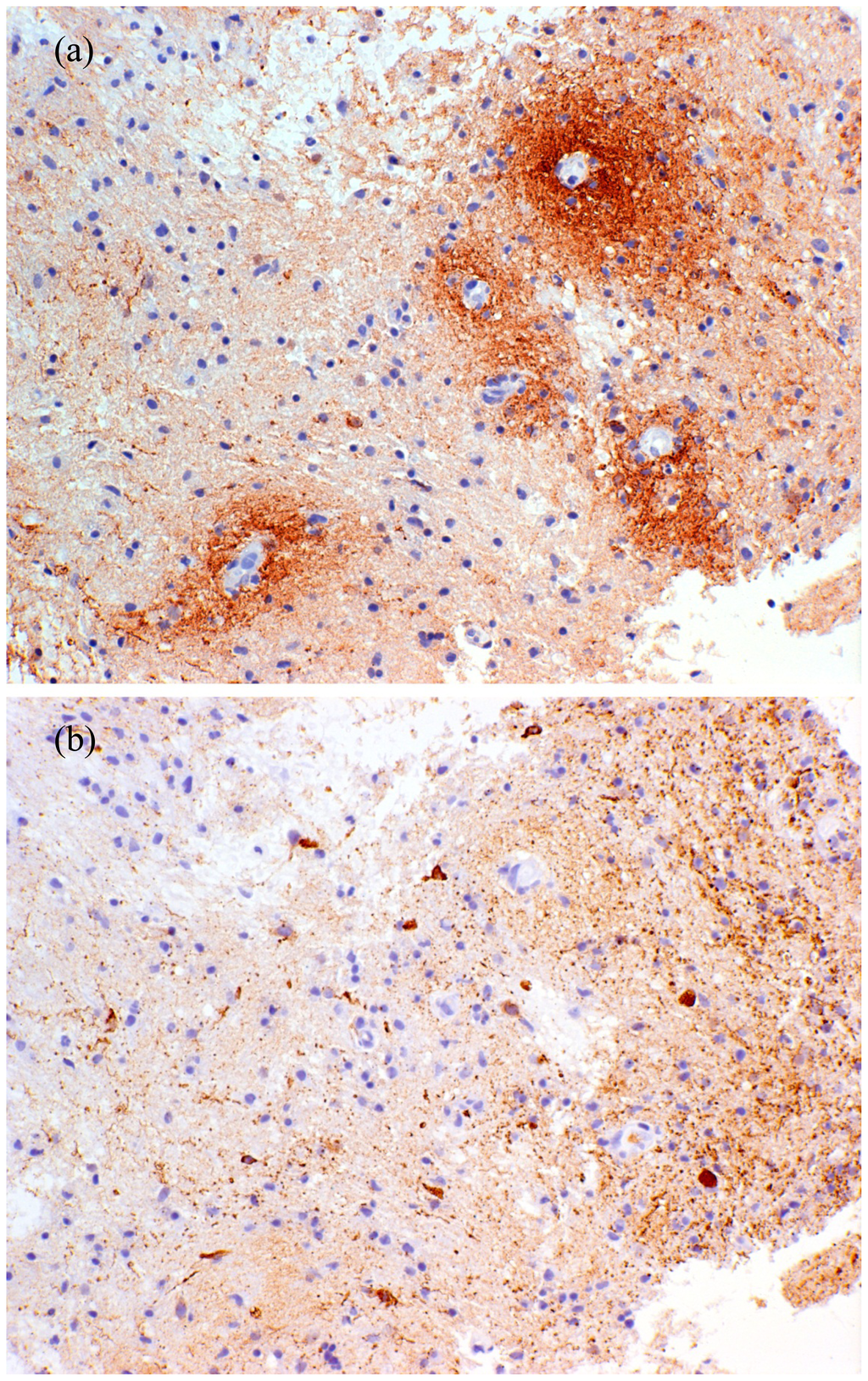 Figure 3. Serial sections from a biopsy of an early brain white matter NMO lesion immunostained for (a) C3d and (b) GFAP. (a) Typical perivascular complement deposition around numerous small vessels; (b) Particulate GFAP-positive debris with a perivascular accentuation indicating massive astrocyte destruction in a region with relatively preserved myelin architecture. Note that no normal astrocytes are visible.
