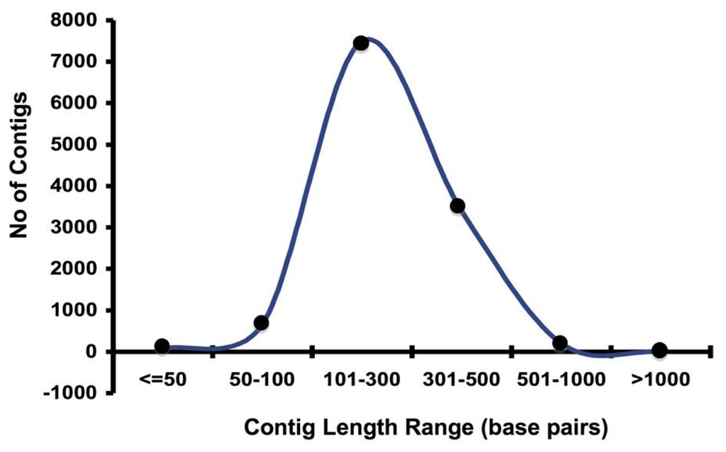 Contig length range of the assembled contigs represented in the Asian rice gall midge (GMB4) library.