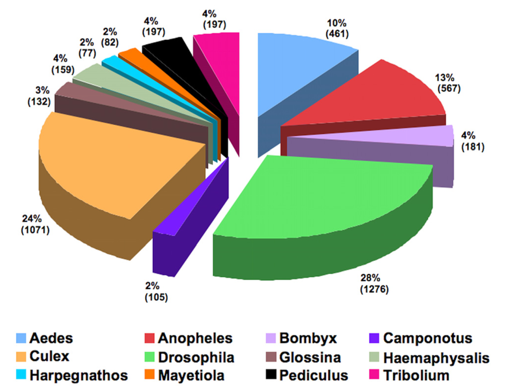 A pie chart distribution depicting top BLASTX hits of the Asian rice gall midge transcripts to various arthropods.