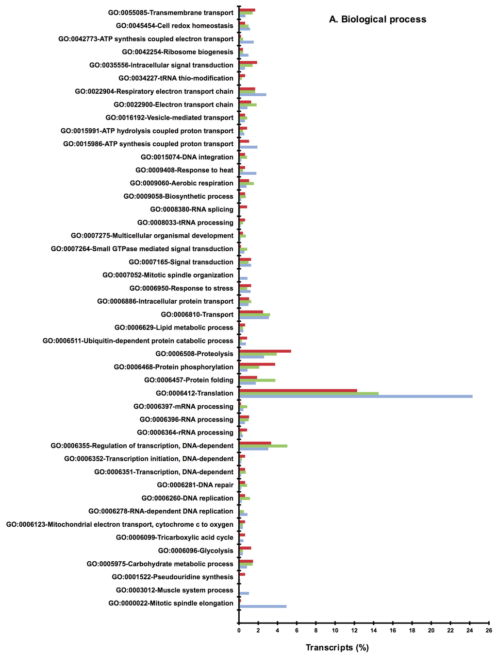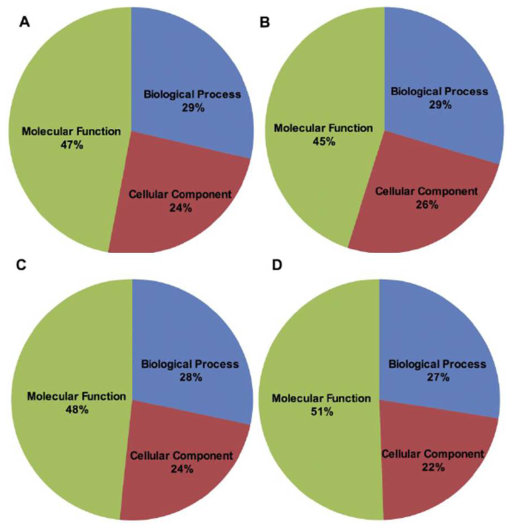 Gene ontology distribution of the transcript sequences of Asian rice gall midge. Percentage of transcripts categorized into biological process, molecular function and cellular components of (A) all sequences (includes pooled transcripts of both GMB4 maggots from SH and RH) (B) transcripts commonly present in both GMB4 maggots from SH and RH (C) specifically present in GMB4 maggots from SH and, (D) specifically present in GMB4 maggots from RH.