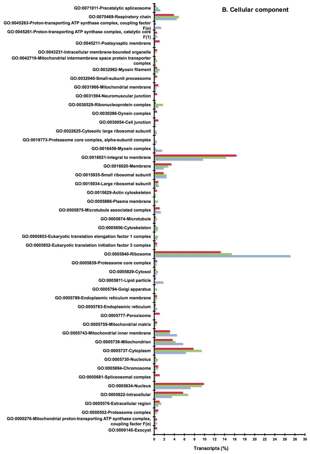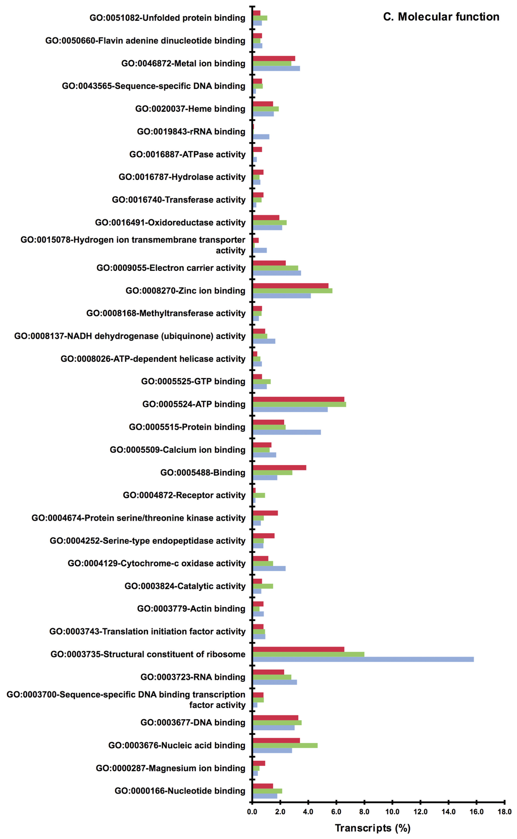 Comparison of transcript distribution of gene ontology terms. Percentage (based on the total number of transcripts in each category i.e., SH, RH and Common) of transcripts specifically present in GMB4 maggots from SH (green bars), RH (brown bars) and commonly (blue bars) present in both the samples categorized in different GO terms of (A) biological process; (B) molecular function and (C) cellular components.