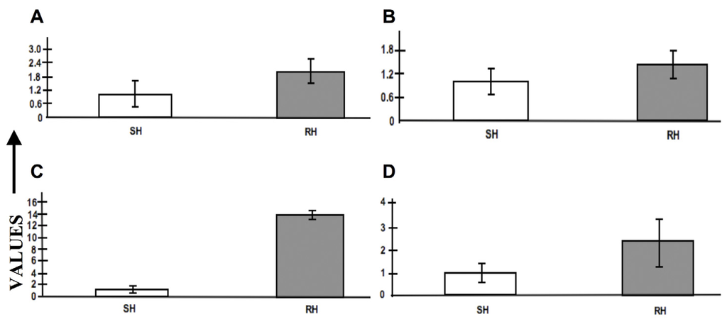 Quantitative real time PCR was performed to study 10 selected genes of Orseolia oryzae. These genes were selected based on the earlier reports [37] of their involvement/modulation in pest-plant interaction. All the selected genes showed differential expression in both SH and RH samples.