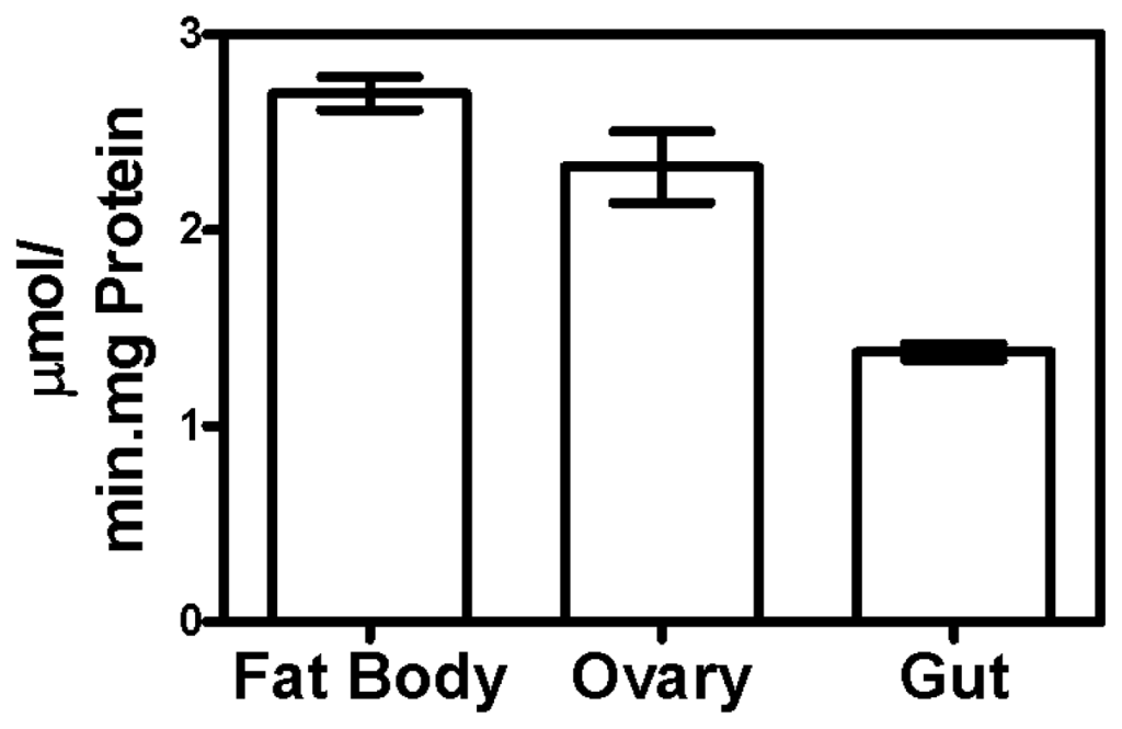 Specific triosephosphate isomerase activity was measured in several tissues of fully engorged ticks. The maximal activities in fat body (2.77 μmols/min/mg protein) and ovarian (2.36 μmols/min/mg protein) tissues were similar, but significantly different (p < 0.05) from gut tissue (1.36 μmols/min/mg protein) (Figure 1).