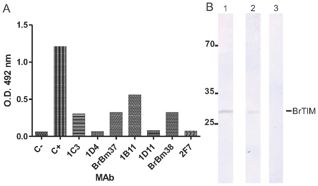 ELISA and Western blot analysis. (A) Seven mAbs against rRmTIM, serum of immunized mice (C+) and non-related control mAb (C−) were used in ELISA to probe rRmTIM; (B) The mAb BrBm37 recognizes rRmTIM (27 kDa): E. coli extract expressing rRmTIM probed with mAbs BrBm37 (1) BrBm38 (2) or non-related control mAb (3). Molecular weight markers are in kDa.