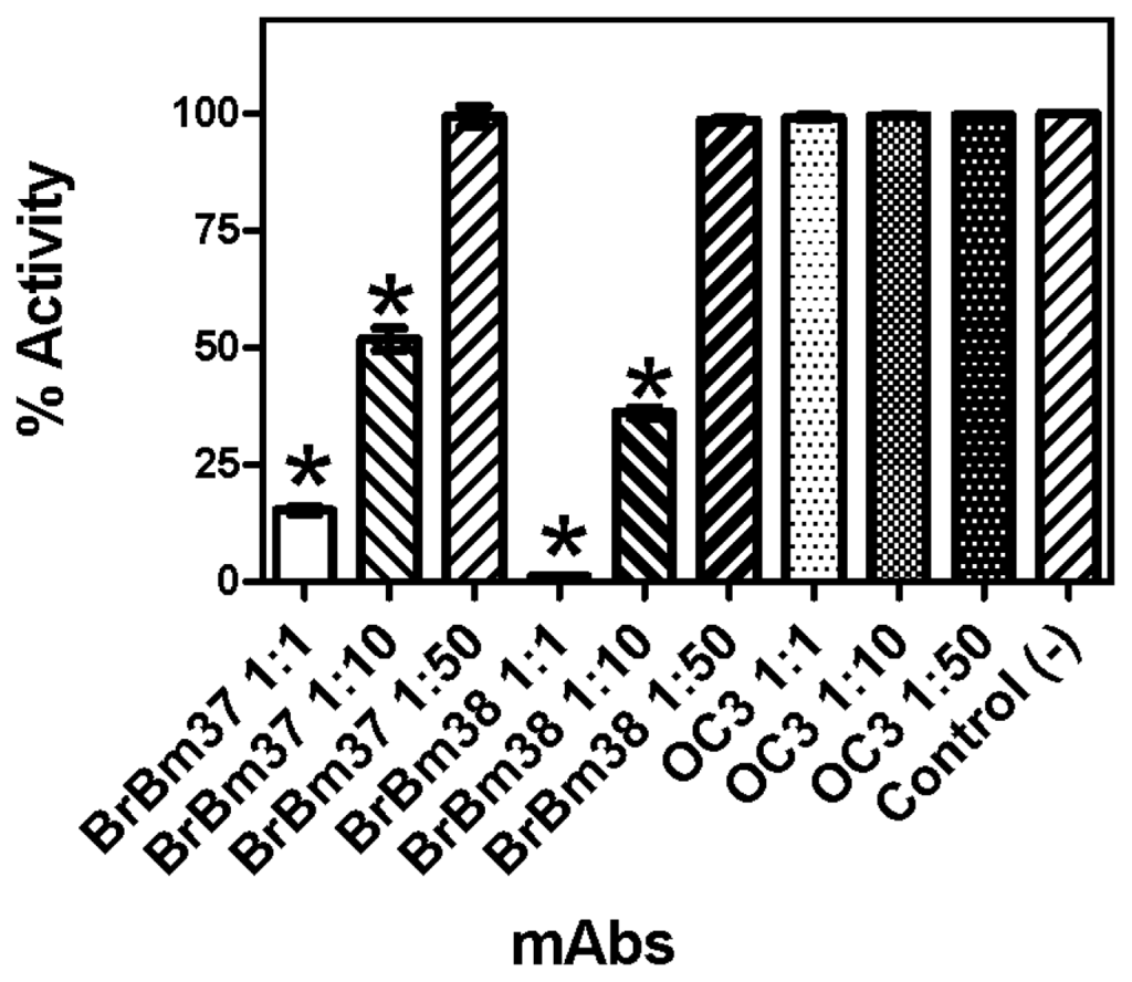 With a high antibody-enzyme ratio (10 μg mAb:10 μg enzyme), BrBm 37 and BrBm38 inhibited rRmTIM by 85% and 98%, respectively (Figure 3). With a low antibody-enzyme ratio (10 μg mAb: 100 μg enzyme), BrBm 37 and BrBm38 inhibited rTIM by 48% and 65%, respectively (Figure 3). The control mAb did not inhibit rRmTIM activity at any of the concentrations tested (Figure 3).