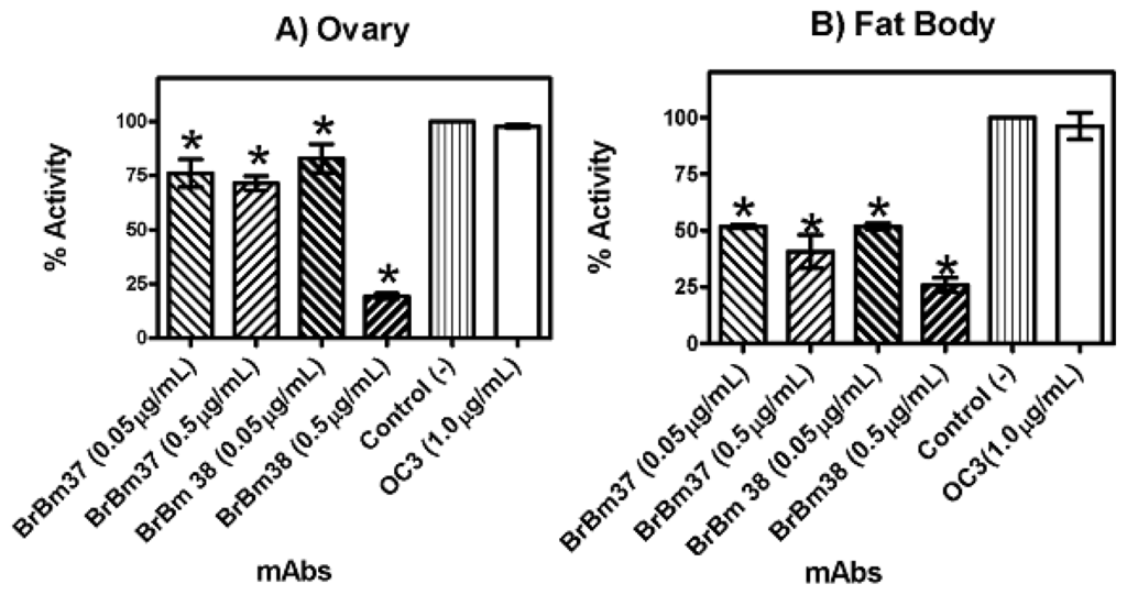 mAbs partly inhibited enzymatic activity in different tissues. In the ovary, the BrBm38 inhibition was 81% (Figure 4A), in the fat body inhibition was 74% (Figure 4B) and in the gut inhibition was 48% (Figure 4C). These inhibition values were similar to the inhibition of the purified rRmTIM. BrBm37 inhibited specific activity by 28% in ovarian tissue (Figure 4A), 56% in fat body (Figure 4B) and 24% in gut tissue (Figure 4C). The inhibition induced by BrBm37 was lower than that of BrBm38, suggesting that the epitope recognized by BrBm37 was not completely identical to BrBm38. In all experiments, a non-related monoclonal antibody OC3 used as control did not reduce specific activity. Results were expressed as mean and standard error of three independent experiments.