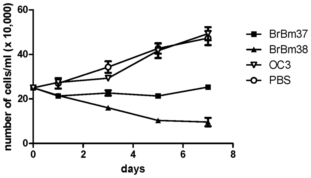 Cell proliferation of tick cell line BME26 after incubation of 50 μg of mAb BrBm37 or BrBm 38 during 0, 1, 3, 5 and 7 days after treatment. The cells were cultured for seven days in the presence of antibodies BrBm37 or BrBm38. As control, 50 μL of phosphate saline buffer or 50 μg of a non-related mAb was used. Cell concentrations were determined using a counting chamber. On all tested days, values of BrBm37 and BrBm38 groups were significantly different (One-way analysis of variance—ANOVA, p < 0.05) as compared to the control groups.