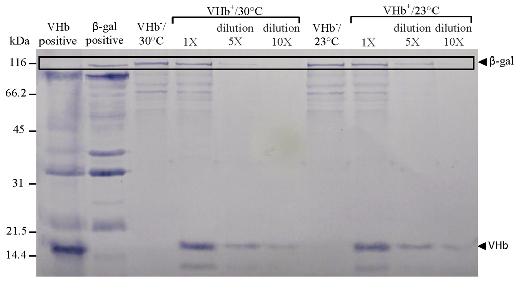 Figure 2). This finding differed from what we first thought, namely, 23 °C cultures could enhance VHb expression (primarily based on the studies reporting that lower temperature cultures can improve recombinant protein expression in