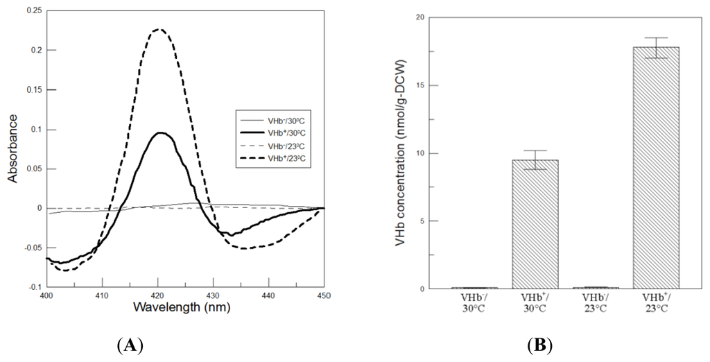 Figure 3 and confirmed again that VHb activity obtained at 23 °C cultures was twofold higher than that at 30 °C cultures. It has been proven that VHb can improve respiratory efficiency and ATP synthesis in recombinant hosts [