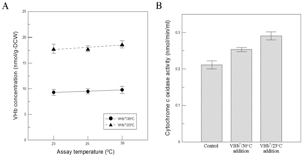 Figure 4A indicated that VHb activity obtained at two temperatures cultures did not obviously change within the assay temperatures between 30 °C and 23 °C, thus this reason can be ruled out. Additionally, the exogenous provision of VHb to the assay conditions of the oxygen-consuming enzyme (cytochrome c oxidase) was also carried out to examine if VHb can increase the oxidase activity. First, the cleared lysates of VHb