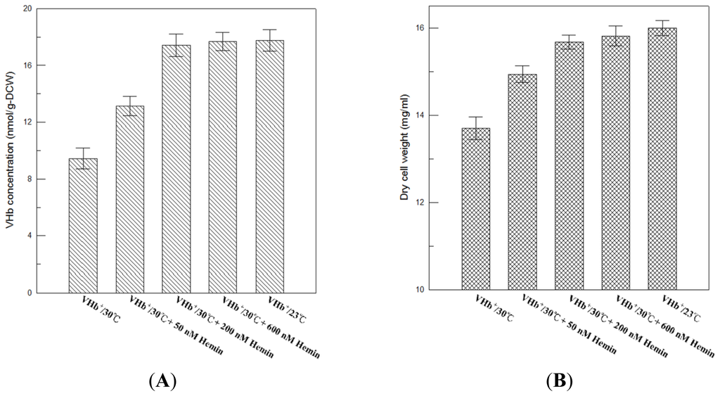 Figure 5B). Increase of VHb activity caused by the exogenous provision of hemin also improved final cell concentration, and the final biomass of 30 °C culture supplemented with 200 nM hemin was close to that of 23 °C culture.