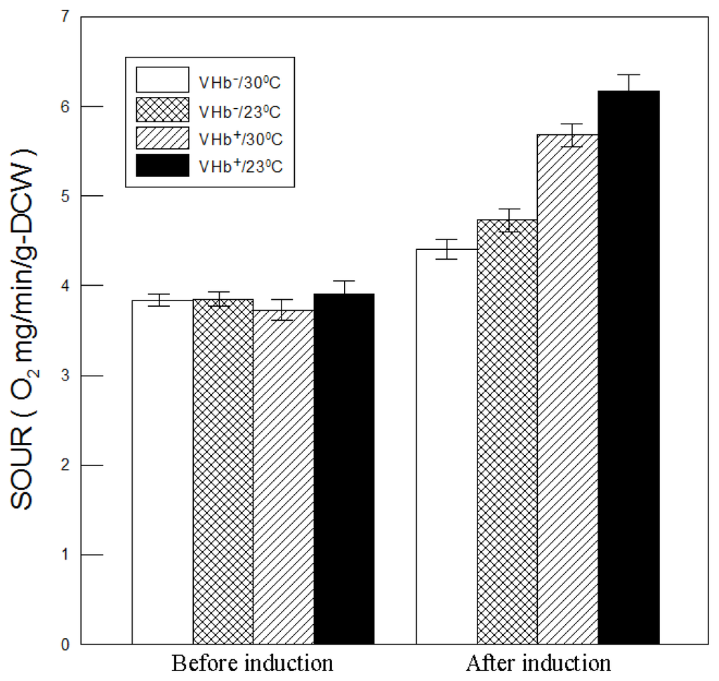 − strain, indicating that VHb effect on SOURs was beneficial at both temperatures but higher at 23 °C. The VHb-expressing strain with a higher oxygen demand has also been reported previously [