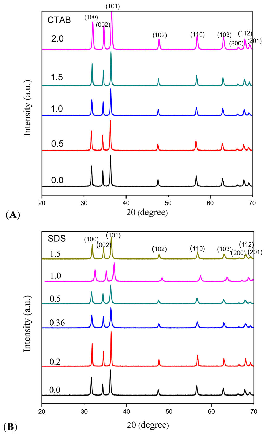 Powder X-ray diffraction (PXRD) patterns of as-prepared ZnO synthesized at different mole ratios of (A) cetyltrimethylammonium bromide (CTAB) (0, 0.5, 1, 1.5, 2) and (B) sodium dodecyl sulfate (SDS) (0, 0.2, 0.36, 0.5, 1, 1.5).