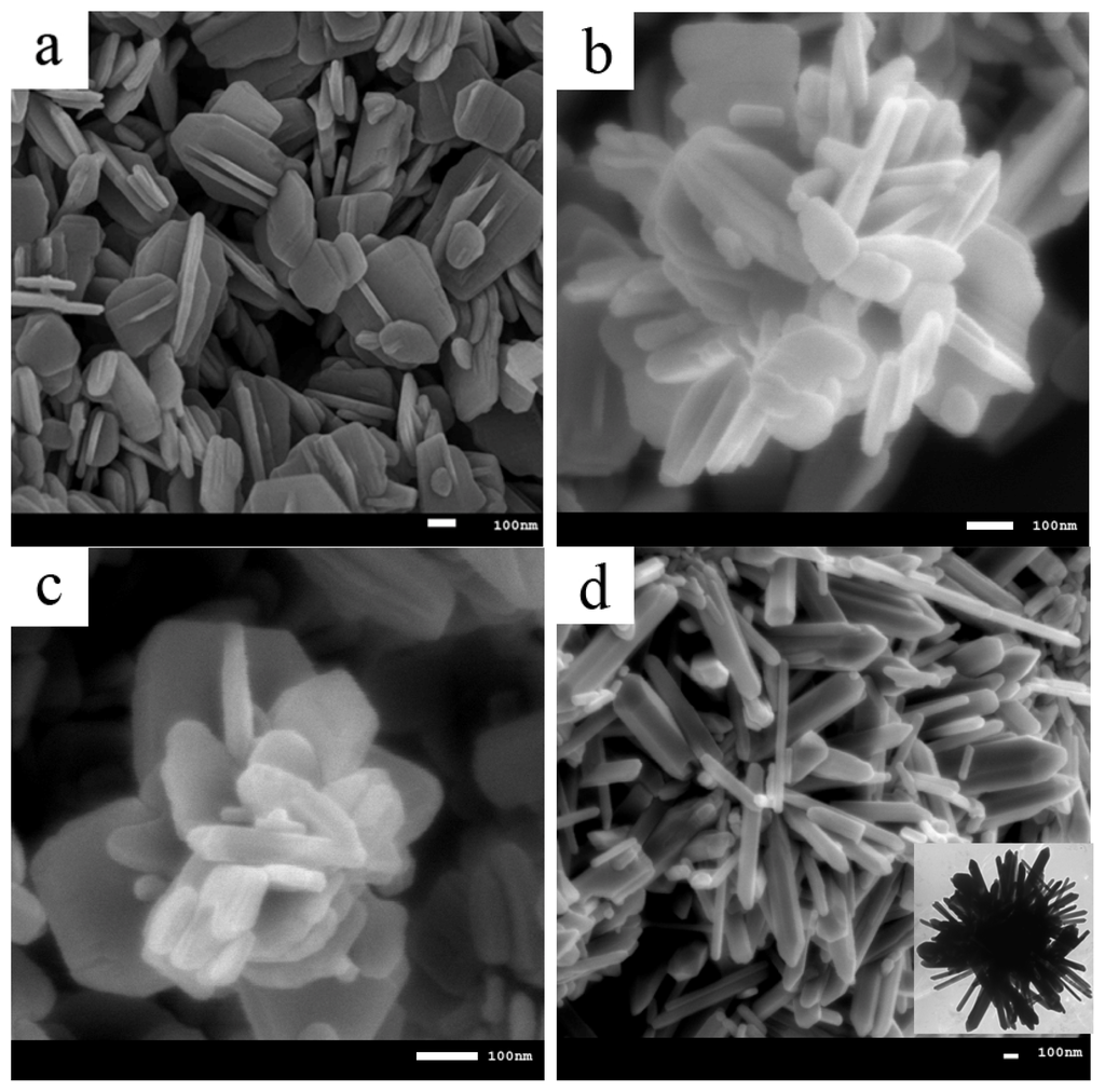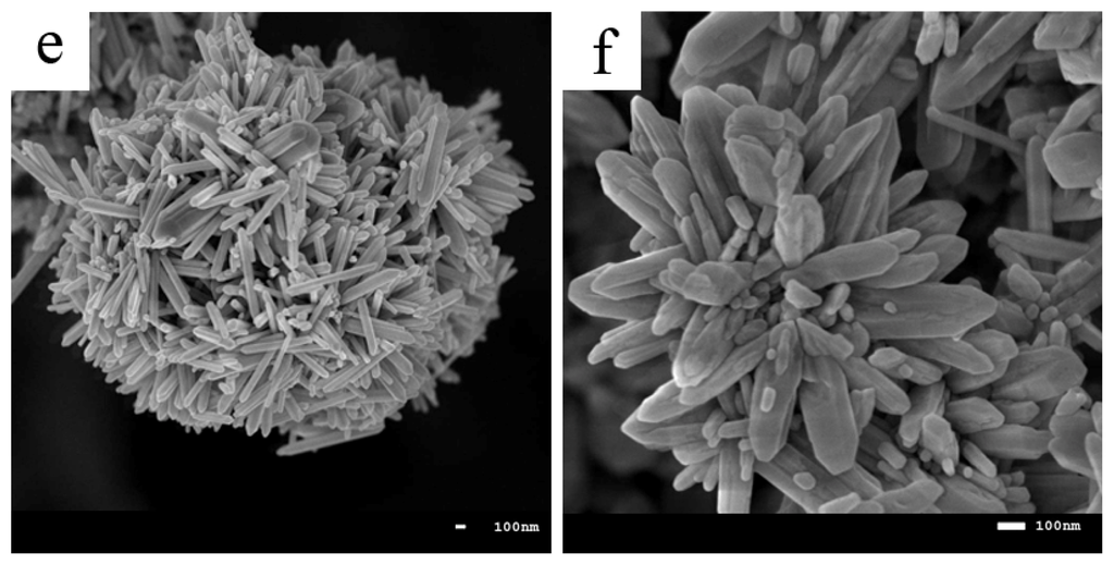 It was found that nanoflaked-shape obtained in presence of CTAB, while by adding little amount of SDS, hexagonal-shaped rods form spherical outline were observed. The length of nanorods are in the range of 100 nm to 2 μm and diameter varies, but below 200 nm. With increasing of SDS molar ratio from 0.2 to 0.36, another morpholgy has revealed which is branch rod-like structure. The length and diameter decreased dramatically to the range of 100–300 nm and 15–50 nm, respectively. Most of rods are agglomorated and seems thicker. The nano- and micro-sized structures can be observed in Figure 3c.