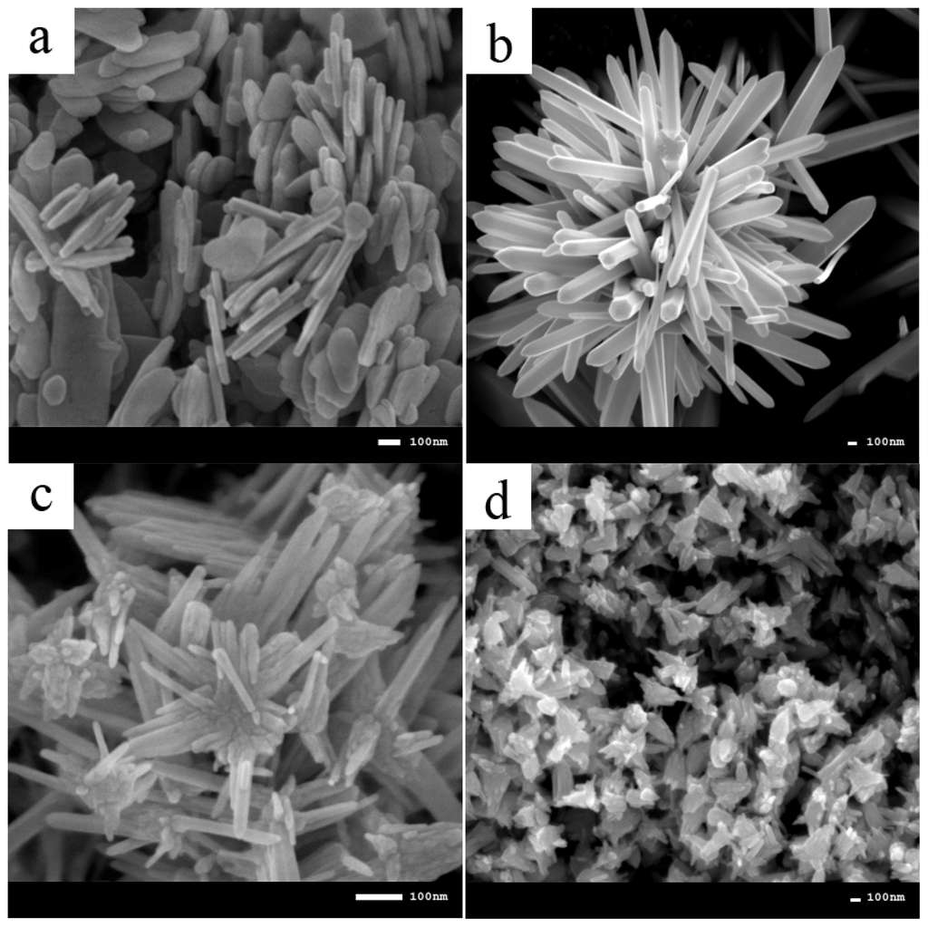 Recently, there have been lots of works on the synthesis of ZnO nanostructures using different surfactants like ethylenediaminetetraacetic acid (EDTA) [], sodium dodecyl sulfate (SDS) [], cetyltrimethylammonium bromide (CTAB) [], polyethylene glycol (PEG) [] and polyethyleneimine (PEI) [,]. These studies mostly investigated the effect of surfactants on the morphology of ZnO crystals separately. Different shapes like nano-wires, flowers, rods, hexagonal bipyramid and microspheres have been achieved by SDS or CTAB individually.