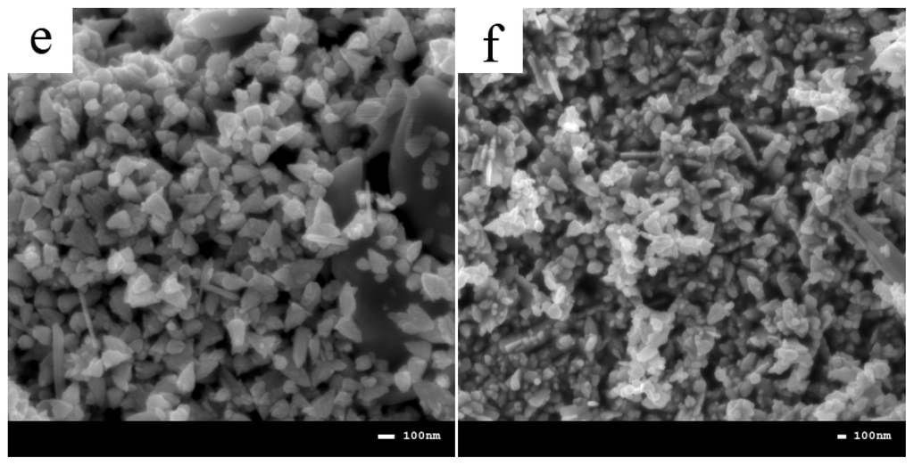 Figure 3d–f show ZnO synthesized at different molar ratios of SDS; 0.5, 1 and 1.5, respectively. The morphology is based on the branch rod-like nanostructures but more agglomoration can be easily observed. Rod’s shape is not clear and nanoparticles look like a triangular structure.