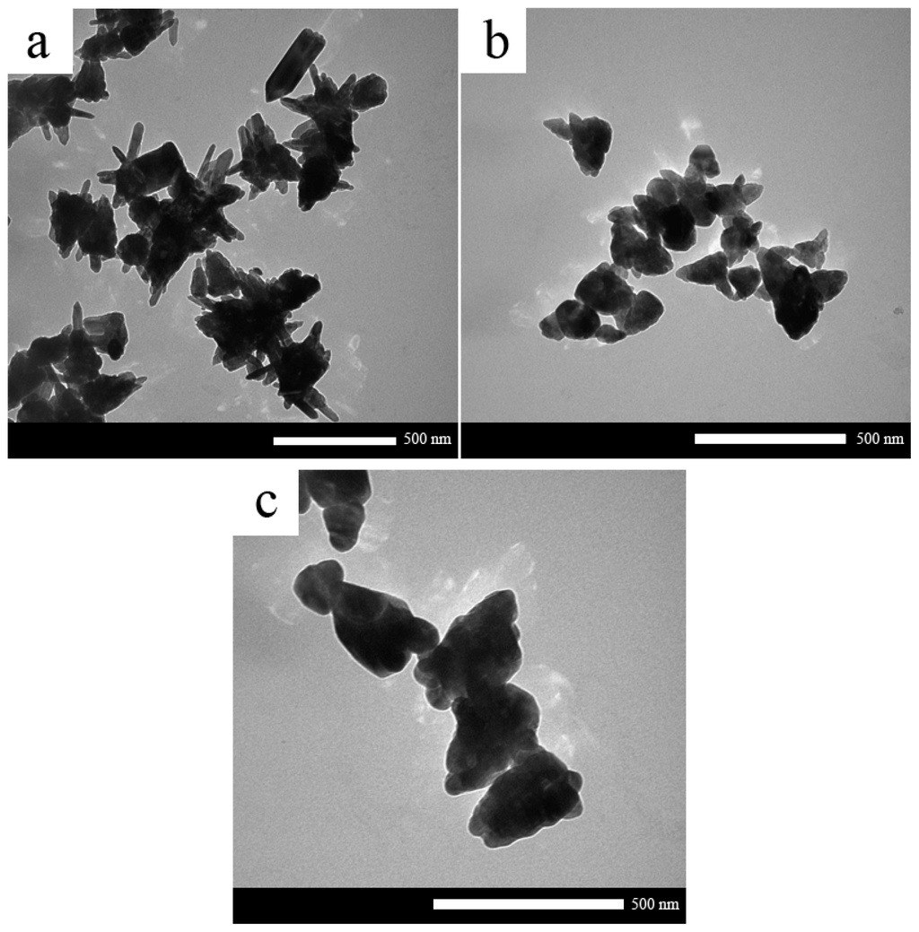 TEM images of as-synthesized ZnO nanostructures with (a) CTAB:SDS = 1:0.5, (b) CTAB:SDS = 1:1 and (c) CTAB:SDS = 1:1.5.