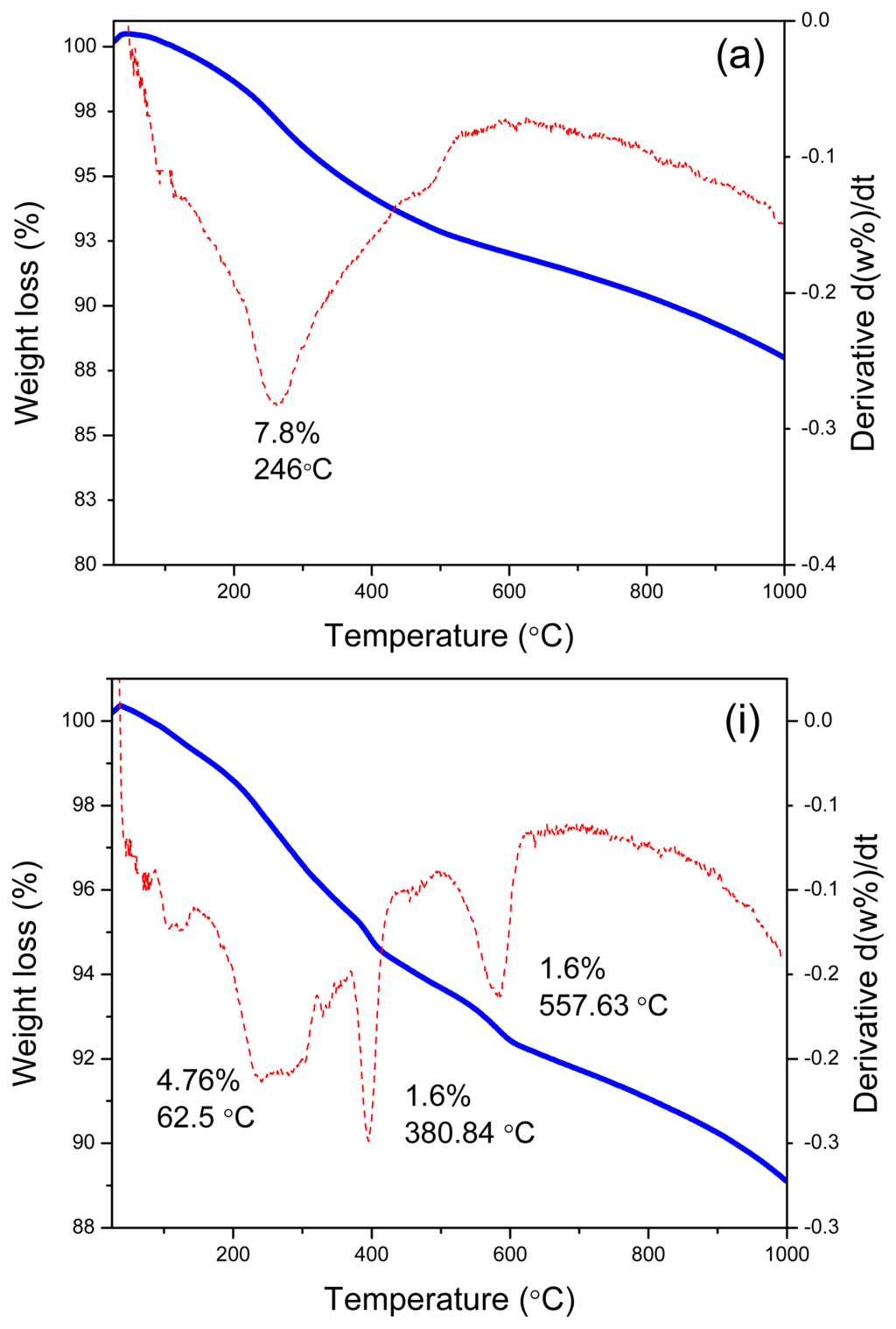 Most of the TGA/DTG curves present similar behavior with one main weight loss step in the temperature range of 30–500 °C including the dehydration of physically adsorbed water from 30–200 °C and decomposition of surfactants from 200 to 500 °C []. Thermal degradation of pure SDS and CTAB were seperately recorded, showing a loss of between 160–380 °C and 180–340 °C, respectively. However it can be easily interpreted from the curves that the remaining weight did not level off even near to 1000 °C. Therefore there is possibility of gradually decomposition of surfactants and shifting to higher temperature. As seen for sample CTAB:SDS = 1:0.36 in Table 1, the offset temperature of surfactants decomposition has shifted to 934 °C.