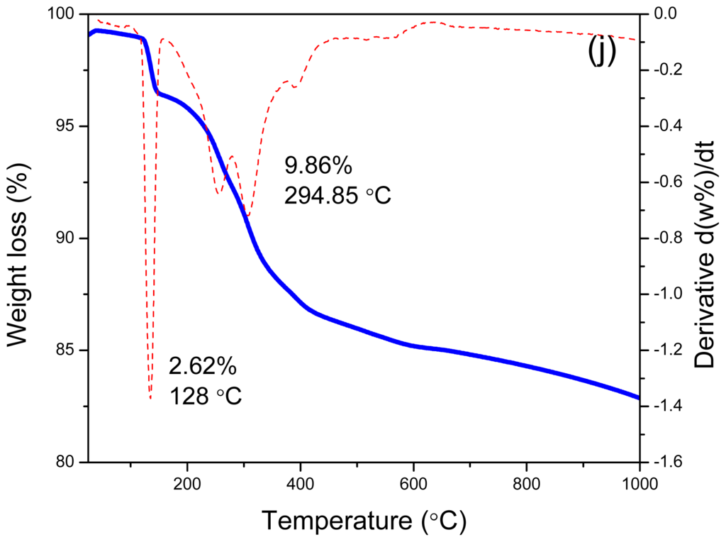 Thermogravimetric and differential thermogravimetric analysis (TGA-DTG) thermogravimetric analysis of as-synthesized ZnO samples prepared at different mole ratios of (a) SDS:CTAB = 1:0; (i) CTAB:SDS = 1:0.5; (j) CTAB:SDS = 1:1.