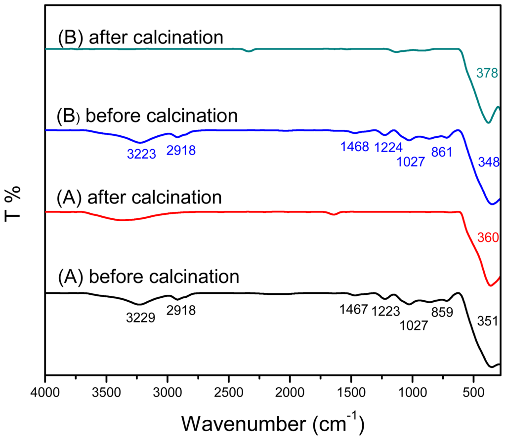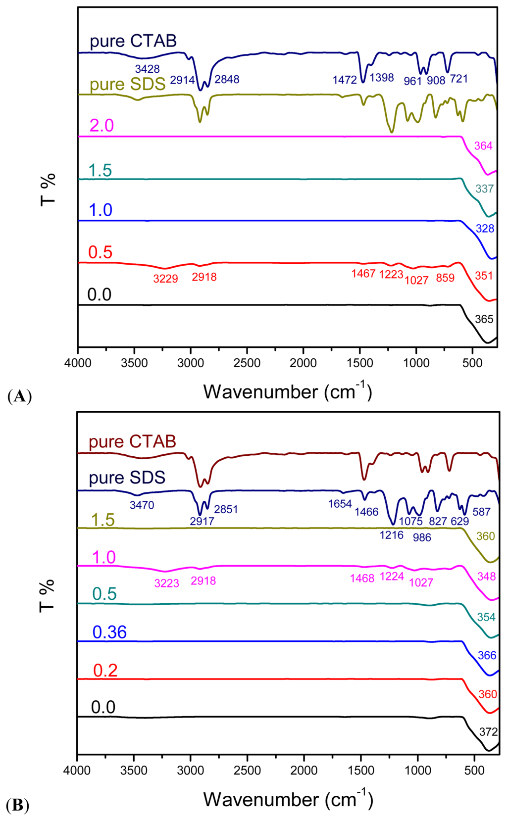 The characteristic peak of ZnO absorption can be clearly observed at 330–370 cm−1 which is less than that of reported in literatures. Wu et al. [] reported two maximum characteristic absorption peaks for ZnO nanorods using CTAB as surfactant at 512 cm−1 (blue-shifted) and another with wavenumber shorter than 500 cm−1. Samaele et al. [] and Prasad et al. [] also reported absorption peak of 470 cm−1 and 422 cm−1 for SDS-modified ZnO particles and nanorods, respectively. It seems that mixture of these cationic-anionic surfactants shifted the characteristic peak of ZnO to lower wavenumbers (blue-shifted) as seen in Figure 6A,B. It is worth to mention that calcination treatment could shift characteristic peaks of ZnO back to higher wavenumbers (Figure 7).