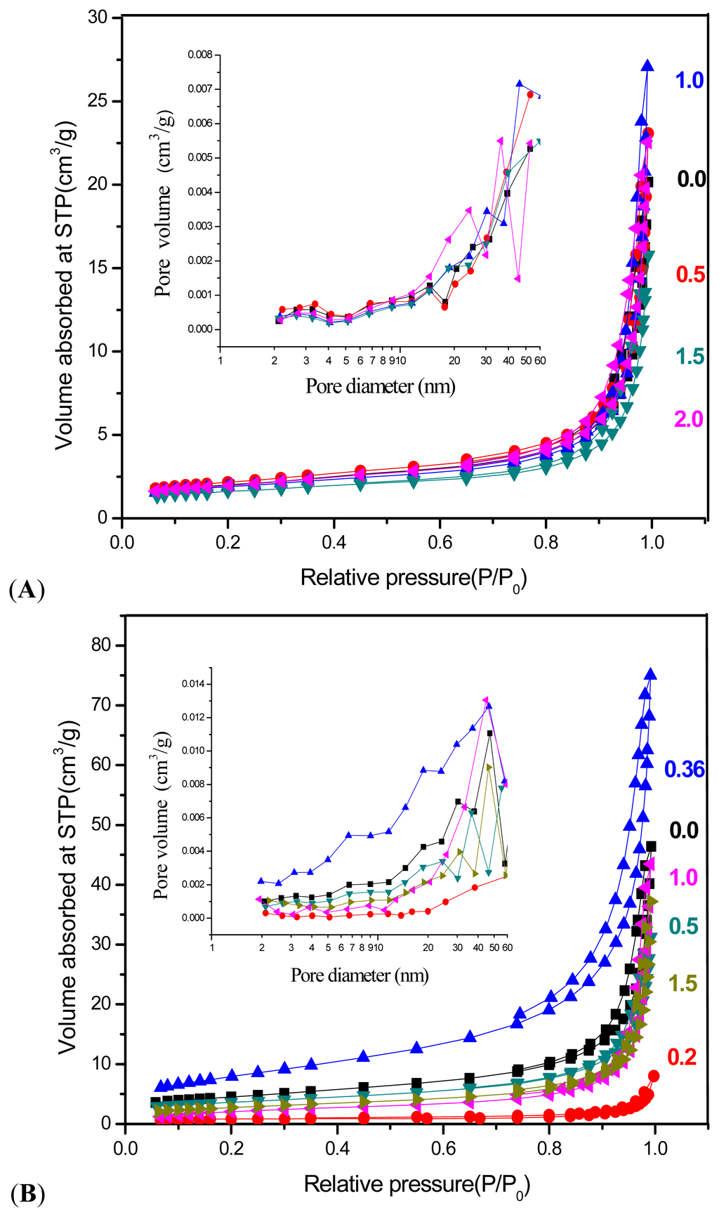 Nitrogen adsorption-desorption isotherms and Barret-Joyner-Halenda (BJH) pore size distribution of as-obtained ZnO nanostructures with different mole ratio of (A) CTAB and (B) SDS.