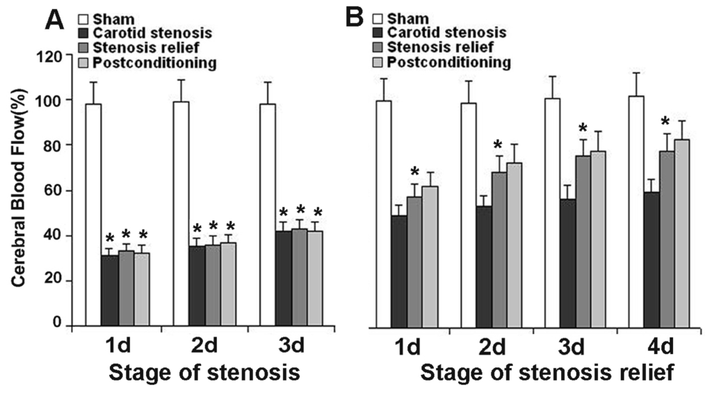 As shown in Figure 1, the cerebral blood flow (CBF) was stable in the sham group, and there was no significant difference at any scheduled time point. When carotid stenosis was maintained, despite the values of CBF could increase from day 1 to day 3, they were still significantly lower than that of the sham group (Figure 1A). By contrast, when the stenosis was relieved, the values of CBF increased markedly in comparison with those in the stenosis group from day 1 to day 4 (Figure 1B). Despite ischemic postconditioning improved the values of CBF, there is no significant difference in CBF between the two groups treated with and without ischemic postconditioning. These results indicated that relief of carotid stenosis could increase CBF, but no significant changes could be found in CBF when ischemic postconditioning is administrated.