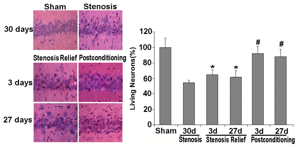 Histological examination of neuron death via hematoxylin-eosin (HE) staining and quantitative analysis of live neurons. When bilateral carotid stenosis was maintained, 55.5% ± 4.8% of the CA1 neurons was found to be alive at day 30. Despite the dead neurons appearing on day 3, the percentage of live neurons was 66.6% ± 6.2% on day 3 and 62.3% ± 9.8% on day 27 when carotid stenosis was relieved. By contrast, when ischemic postconditioning was administrated prior to carotid stenosis relief, the percentage of the live neurons was significantly improved to 92.5% ± 6.7% on day 3 and 88.6% ± 9.1% on day 27, respectively. * p < 0.01 vs. stenosis group; # p < 0.01 vs. stenosis relief group.