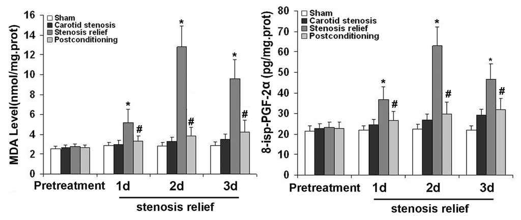 Measurement of the level of oxidized products. At day 1, day 2 and day 3 following the relief of carotid stenosis, the levels of malondialdehyde (MDA) were 5.22 ± 1.31, 12.83 ± 2.11 and 9.62 ± 1.93 times, and 8-iso-PGF2α were 36.79 ± 6.18, 62.93 ± 9.42 and 46.58 ± 7.36 times higher than those in sham and carotid stenosis groups, respectively. By contrast, after being treated with ischemic postconditioning, the levels of MDA decreased to 4.12 ± 0.51, 5.49 ± 1.47 and 5.45 ± 1.26 times, and 8-iso-PGF2α decrease to 30.13 ± 4.32, 35.85 ± 6.72 and 33.87 ± 4.47 times, respectively. * p < 0.01 vs. sham group and stenosis group; # p < 0.01 vs. stenosis relief group.
