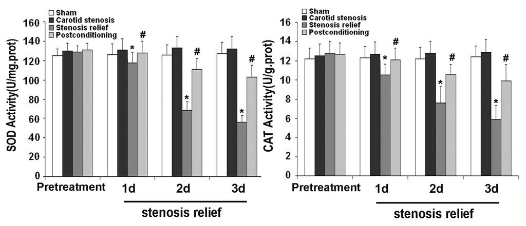 Intracellular ROS is mainly cleared by anti-oxidative enzymes such as SOD and CAT, thus we assayed the activities of SOD and CAT in the CA1 neurons pretreated with or without ischemic postconditioning prior to relief of carotid stenosis. As Figure 4 showed, when compared with those in sham and carotid stenosis groups, the activities of SOD and CAT decreased markedly from day 1 to day 3 following the relief of carotid stenosis. However, their reduction at each corresponding time point was inhibited by ischemic postconditioning. This indicated that ischemic postconditioning could significantly improve the activities of SOD and CAT that were damaged by the relief of carotid stenosis.