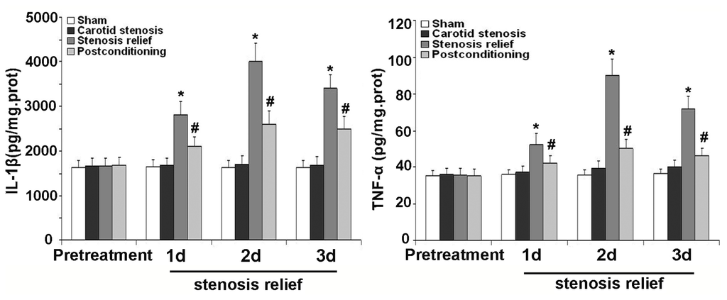 To make sure the influence of inflammatory response on neuronal death and protective effects of ischemic postconditioning, we examined the concentration changes of inflammatory factor IL-1β and TNF-α in the hippocampus CA1 neurons treated with or without ischemic postconditioning before the relief of carotid stenosis. As shown in Figure 5, protein levels of IL-1β and TNF-α increased significantly at day 1, 2 and 3 after bilateral carotid artery stenosis was relieved, when compared with the values of sham group and carotid stenosis group. Nevertheless, their expression decreased significantly when the rats were treated with ischemic postconditioning. This indicated that inflammatory response involves in the pathological course of neuronal death caused by relief of carotid stenosis and it could be alleviated by ischemic postconditioning.
